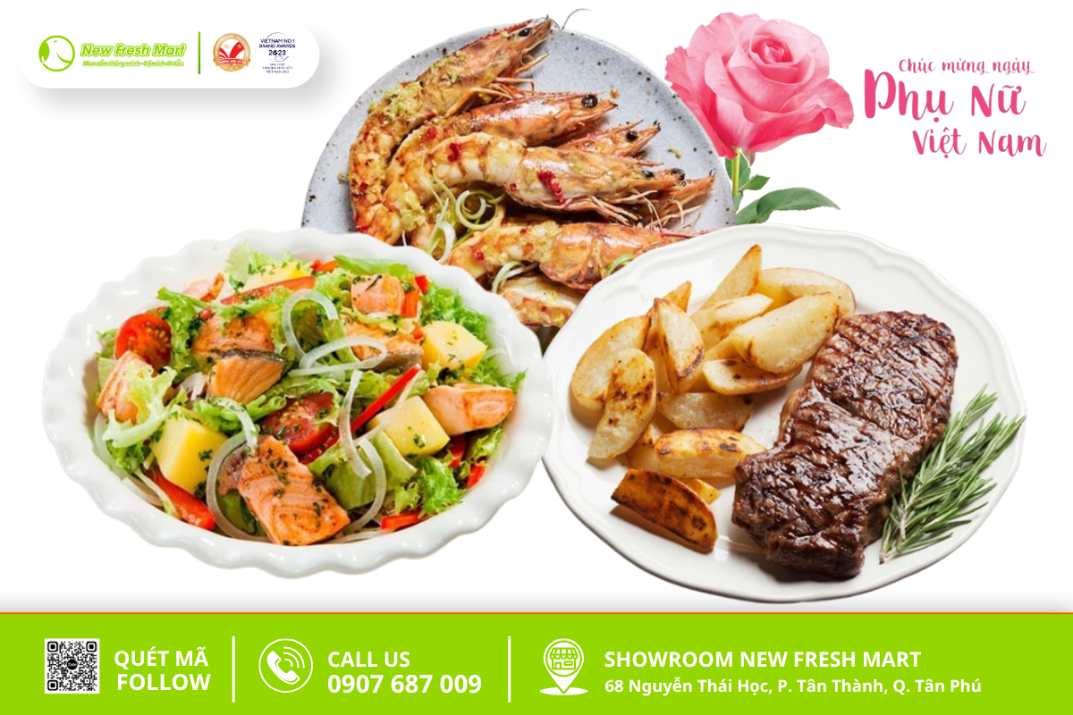 Ngày Phụ nữ Việt Nam 20/10 không chỉ là dịp để tặng hoa, tặng quà, mà còn là thời điểm tuyệt vời để ghi dấu ấn bằng một bữa ăn giàu cảm xúc. Với New Fresh, bạn không cần lo chọn món hãy để chúng tôi lo phần “nguyên liệu chất lượng”, bạn chỉ cần vào bếp và mang tới niềm vui cho người phụ nữ bạn yêu thương. Dưới đây là thực đơn món ngon gồm 3 món chính được New Fresh gợi ý, đảm bảo vừa nhanh gọn, vừa đẳng cấp: