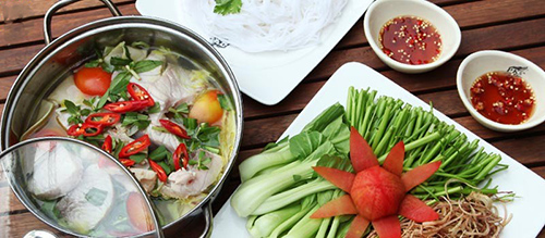 – Đặt nồi lẩu lên bếp, khi ăn nấu sôi nước lẩu, cho cá vào và nhúng rau, dọn kèm bún và chén mắm ớt.