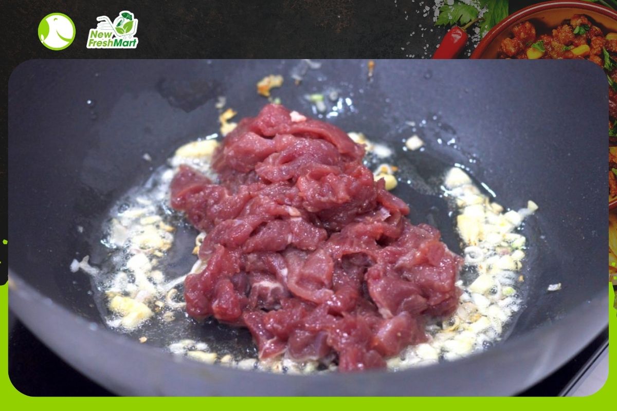 Thêm dầu ăn vào chảo rồi đun nóng, sau khi dầu nóng, đổ dầu này ra rồi thêm dầu nguội vào. Cho tiếp tỏi, gừng và phi thơm rồi cho thịt bò đã ướp vào xào nhanh tay trên lửa lớn