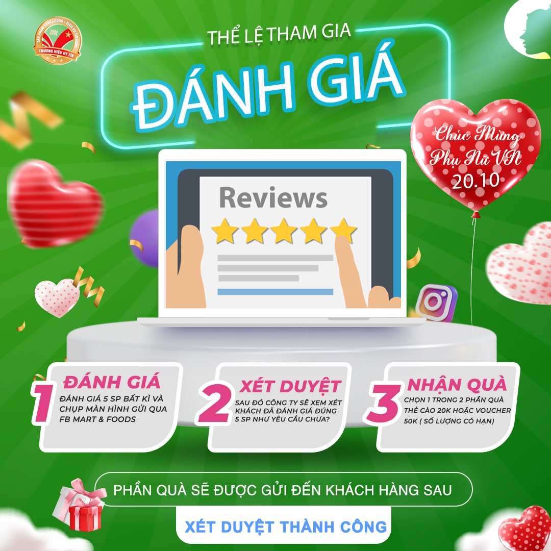 - Đánh giá 5 sản phẩm bất kì trên website Mart hoặc Foods sẽ được tặng một thẻ cào 20k hoặc 1 voucher trị trá giá 50k (HSD: 31/10/2022)