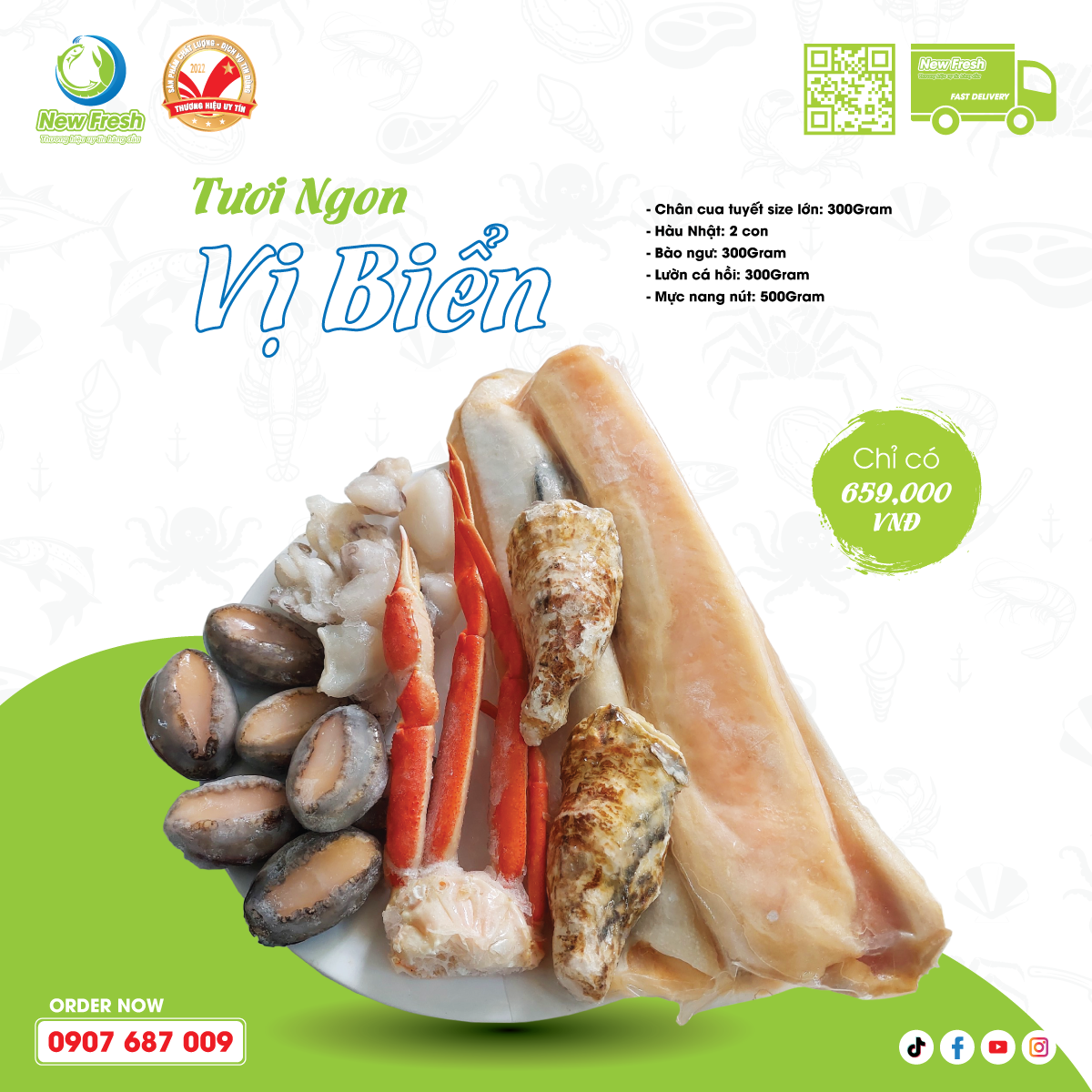 - Đóng gói: Chân cua tuyêt size lớn 1 cụm - 300gram, Hàu nhật (size 20-40 )- 2 con, Bào ngư đông lạnh Nissi (size 20-22) - 300gram, Lườn cá hồi 5+ - 300 gram, Mực nang nút (size 20-40) - 500gram