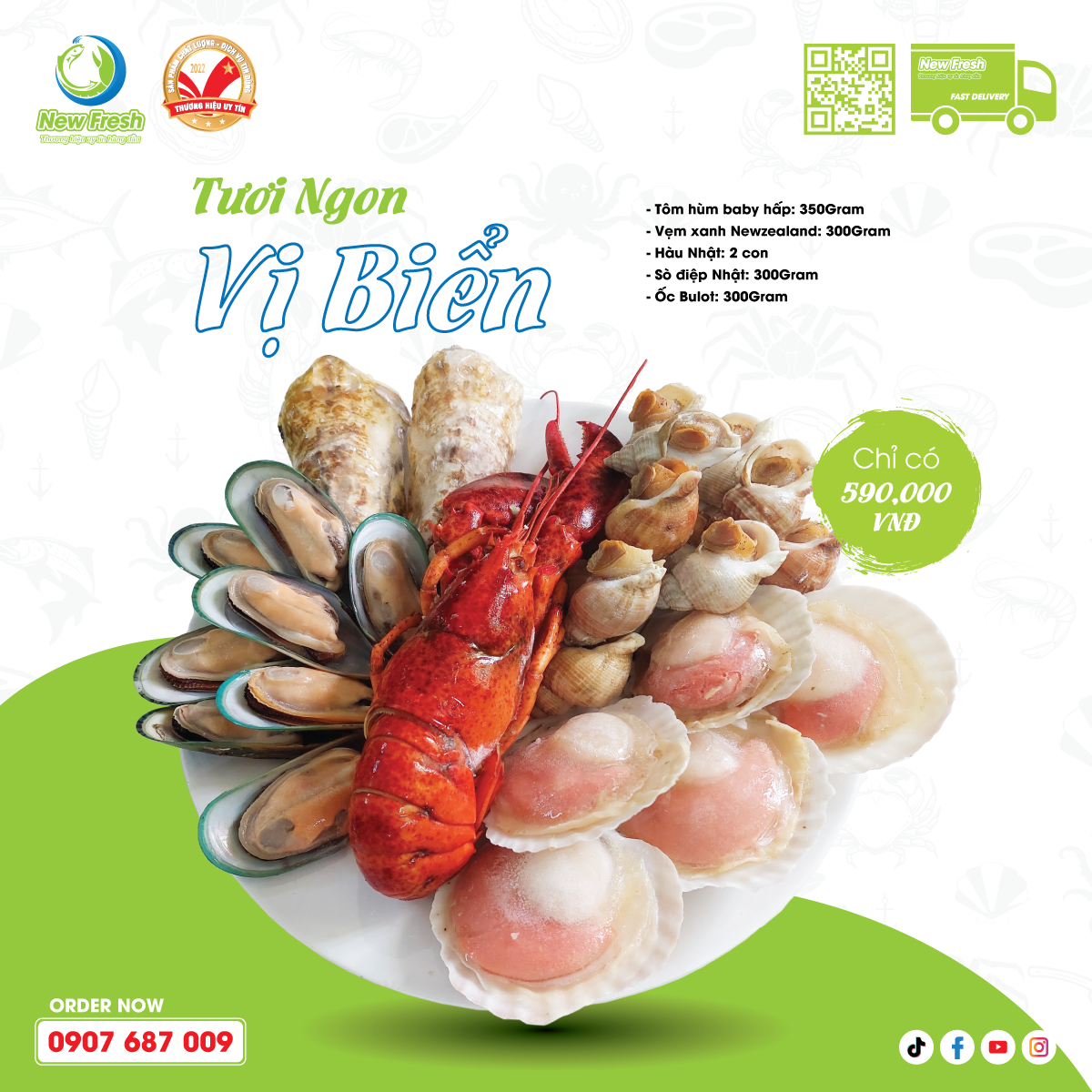 - Đóng gói: Tôm hùm baby hấp - 1 con 350 gram, Vẹm xanh Newzealand - 300 gram , Sò điệp Nhật nửa mảnh nhỏ,- 300 gram Hàu Nhật (size 9-11) - 2 con, Ốc bulot (size 20-40) - 300gram