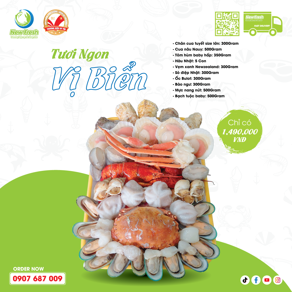 - Đóng gói: Tôm hùm baby hấp - 1 con 350 gram, Chân cua tuyết size lớn- 1 cụm, 300gram/cụm, Cua nâu Nauy (size 500gr), Vẹm xanh Newzealand - 300gran, Sò điệp Nhật nửa mảnh nhỏ, Hàu Nhật (size 9-11) - 2 con, Ốc bulot - 300 gram, Bào ngư đông lạnh Nissi (size 20-22) - 300gram, Mực nang nút (size 20-40)- 500gram, Bạch tuộc baby - 500gram