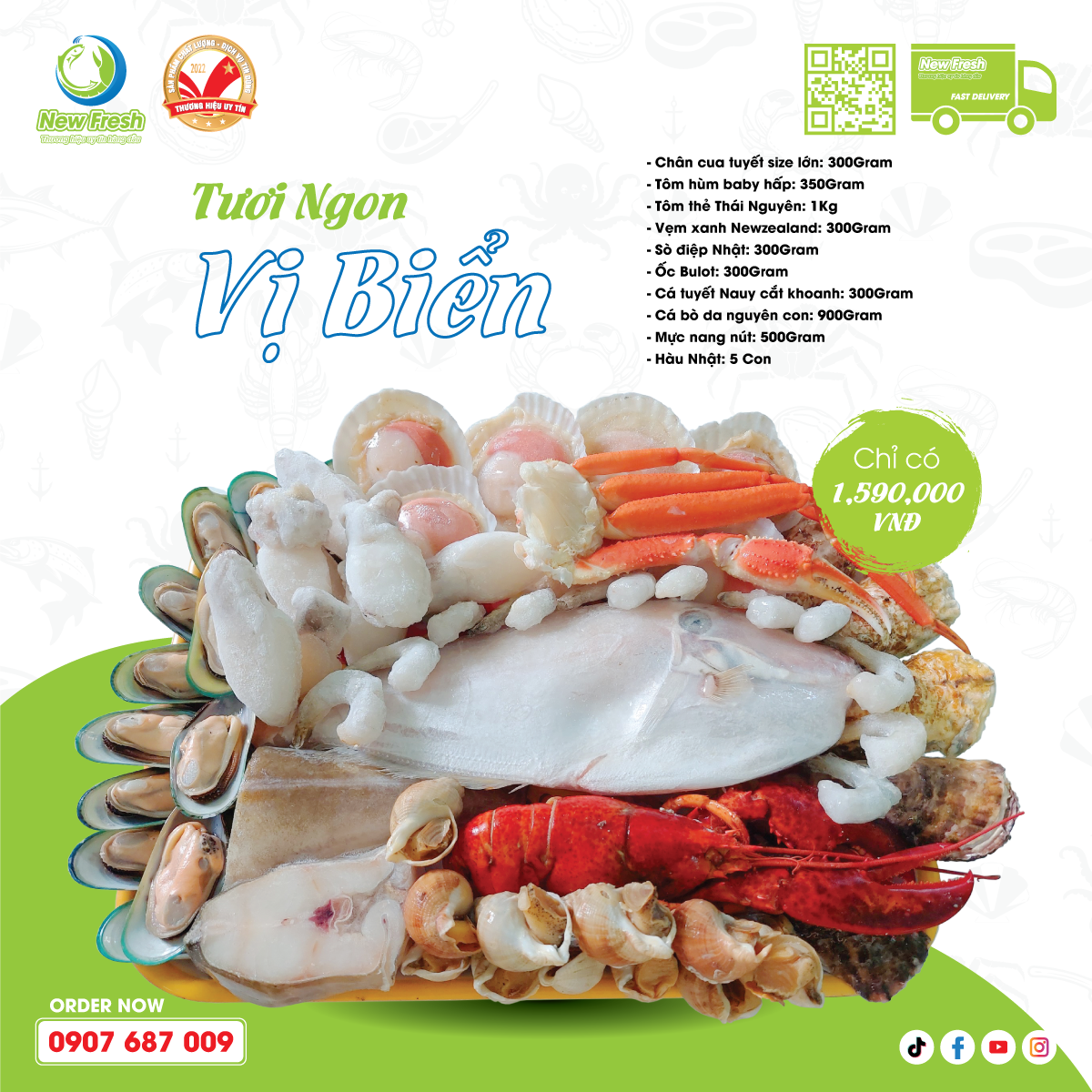 - Đóng gói: Chân cua tuyết size lớn- 1 cụm, 300gram/cụm, Tôm hùm baby hấp- 1 con, 350gram/con, Tôm thẻ sinh thái nguyên con (size 30-40) - 1kg, Vẹm xanh Newzealand - 300gram, Sò điệp Nhật nửa mảnh nhỏ- 300gram, Ốc bulot (size 20-40) - 300gram, Cá tuyết Nauy cắt khoanh - 300gram, Cá bò da nguyên con - 1 con, 900gram/con, Hàu Nhật (size 9-11) - 5 con, Mực nang nút (size 20-40) - 500gram.