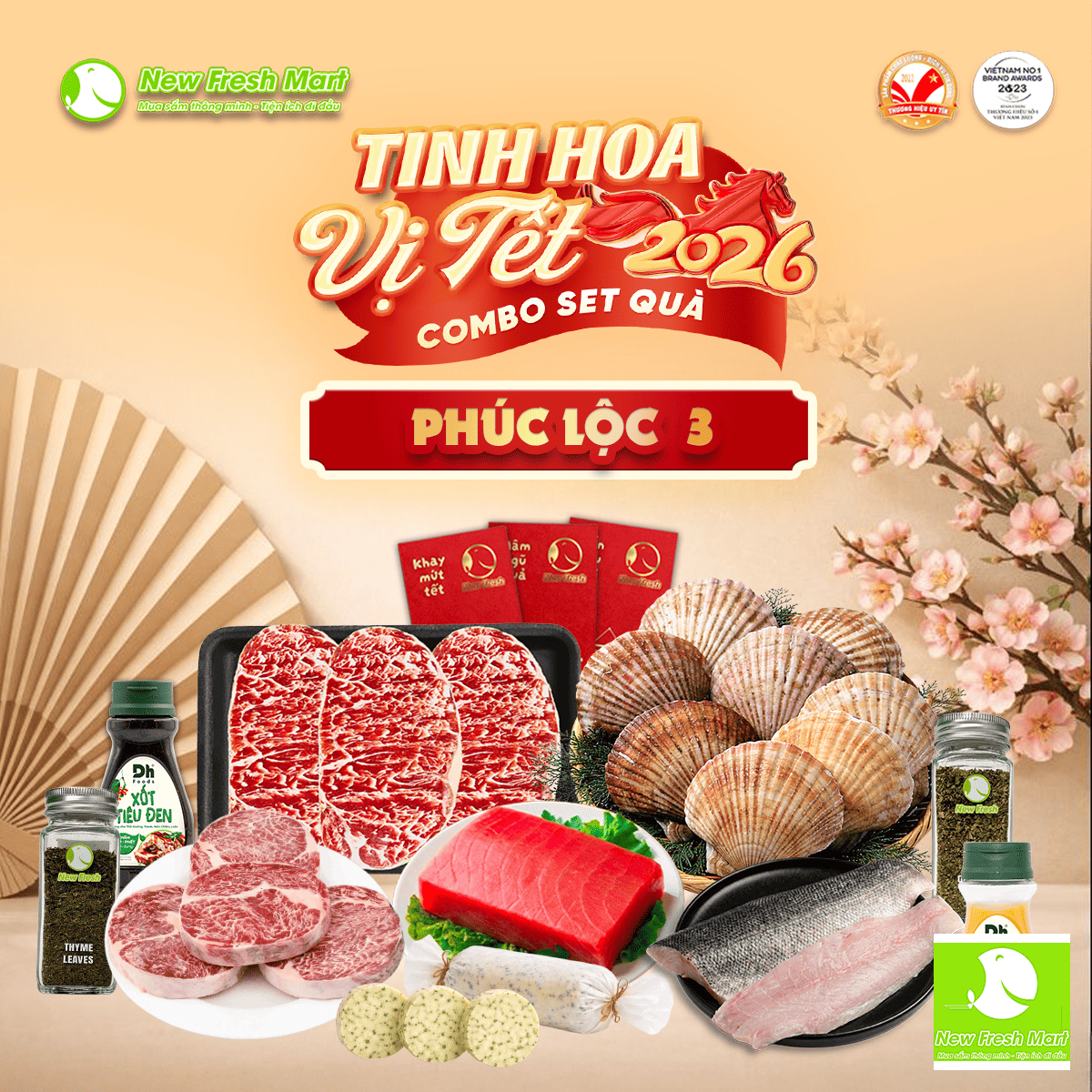 Combo gồm thăn ngoại bò Hokubee và đầu thăn ngoại Hokubee áp chảo/nướng, cá ngừ Saku dùng sashimi hoặc áp chảo nhanh, cá chẽm fillet nướng bơ thảo mộc/chiên sốt, và sò điệp Nhật nguyên con nướng bơ/phô mai. Kèm theo sốt tiêu đen, sốt phô mai DHFoods, bơ thảo mộc, thyme và oregano, giúp mâm tiệc Tết đa dạng, sang trọng và tròn vị cùng New Fresh Mart.