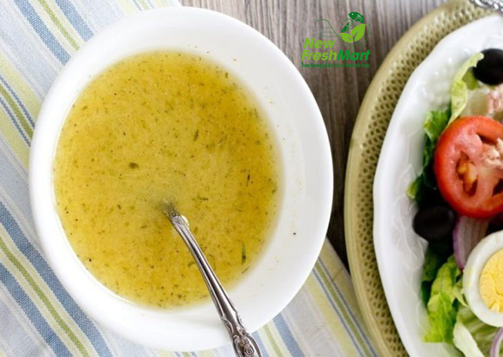 Cho nguyên liệu làm nước sốt gồm: 1/4 chén dầu ô liu, 1/4 chén giấm, 1 muỗng cà phê mật ong, 1 muỗng cà phê mù tạt, 1/4 muỗng cà phê muối, tiêu vào chén và khuấy đều.