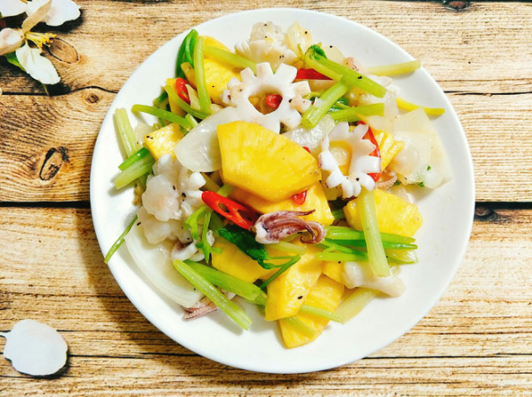 - Bạn đem mực cắt hoa rã đông. Dứa gọt vỏ rồi khoét bỏ hết mắt dứa, thái thành những miếng vừa ăn.