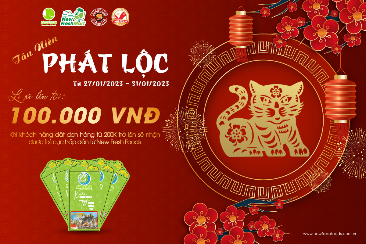 Khi mua hàng trên toàn bộ hệ thống New Fresh Foods sẽ nhận được Lì Xì lên tới 100k.