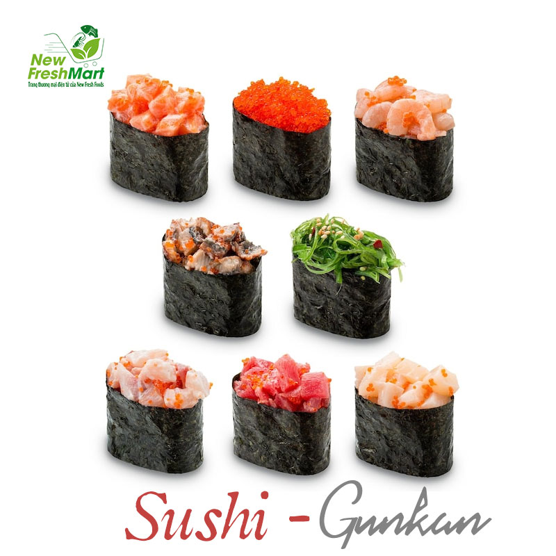 Gunkan: Là loại sushi có phần cơm được bao quanh bởi lá rong biển và được xếp lên trên là: Trứng cá hồi, Trứng cá tuyết, trứng cua…
