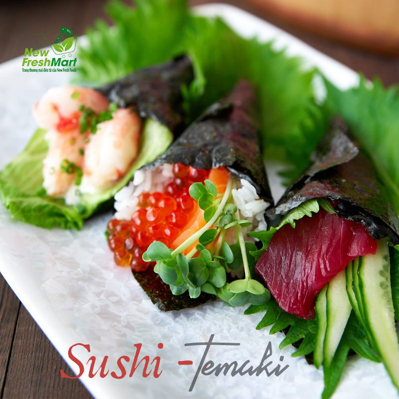 Temaki: Là loại sushi có hình nón, gồm cơm và nhân là các loại hải sản + rau, được cuộn trong lá rong biển.