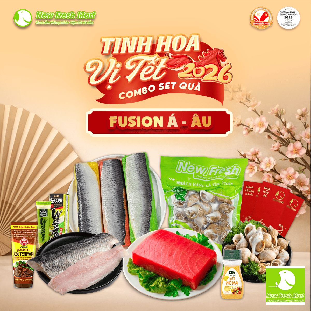 SET 1 – FUSION (Á – Âu) là lựa chọn quà Tết tinh tế, kết hợp hài hòa giữa ẩm thực hiện đại và truyền thống. Cá ngừ Saku 4A thích hợp làm sashimi, tataki hoặc áp chảo sốt tiêu nhẹ; cá trích ép trứng Nissi dùng ngay cho món khai vị kiểu Nhật hoặc sushi cuộn. Cá chẽm fillet linh hoạt chế biến áp chảo bơ, sốt teriyaki hoặc nướng phô mai, trong khi ốc Bulot chỉ cần luộc, nướng bơ tỏi hoặc dùng kèm mù tạt là đã tròn vị. Bộ sốt teriyaki, sốt phô mai đi kèm giúp hoàn thiện thực đơn Á – Âu chỉ trong vài bước, phù hợp làm quà Tết cao cấp cho đối tác, khách hàng và doanh nghiệp.