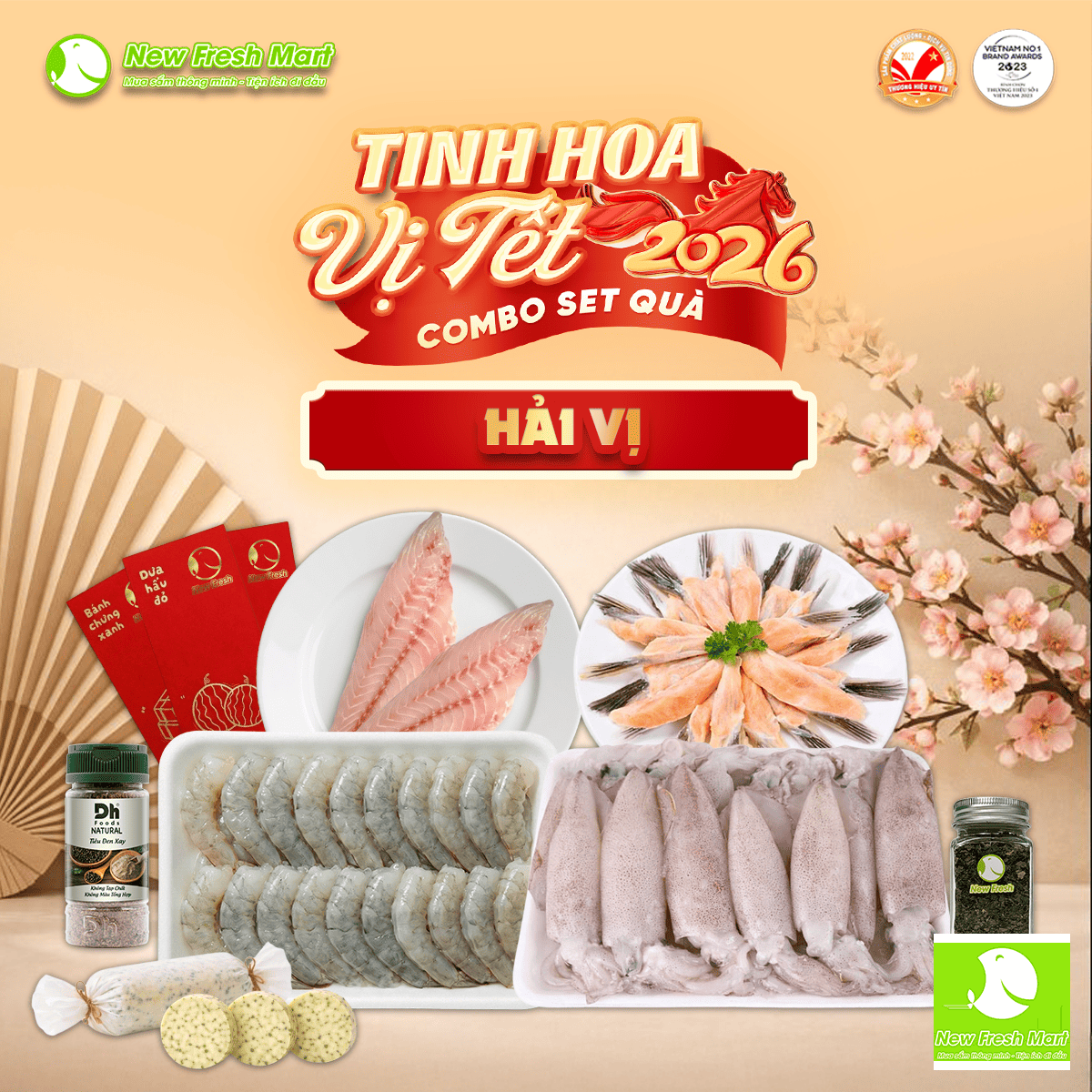 SET 6 – HẢI VỊ là sự kết hợp hài hòa của những nguyên liệu hải sản dễ chế biến, đậm vị biển. Cá mú fillet phù hợp hấp xì dầu, áp chảo bơ hoặc nấu canh chua; mực trứng lý tưởng cho các món hấp gừng, nướng, chiên nước mắm. Tôm sú nõn tiện lợi để xào bơ tỏi, chiên hoặc nấu lẩu, trong khi vây cá hồi có thể chế biến thành món chiên giòn, nướng hoặc nấu súp béo thơm. Bộ bơ thảo mộc, tiêu xay và parsley giúp hoàn thiện hương vị tinh tế cho các món Á – Âu, tạo nên một set quà Tết trang nhã, dễ dùng và phù hợp tặng doanh nghiệp, đối tác.