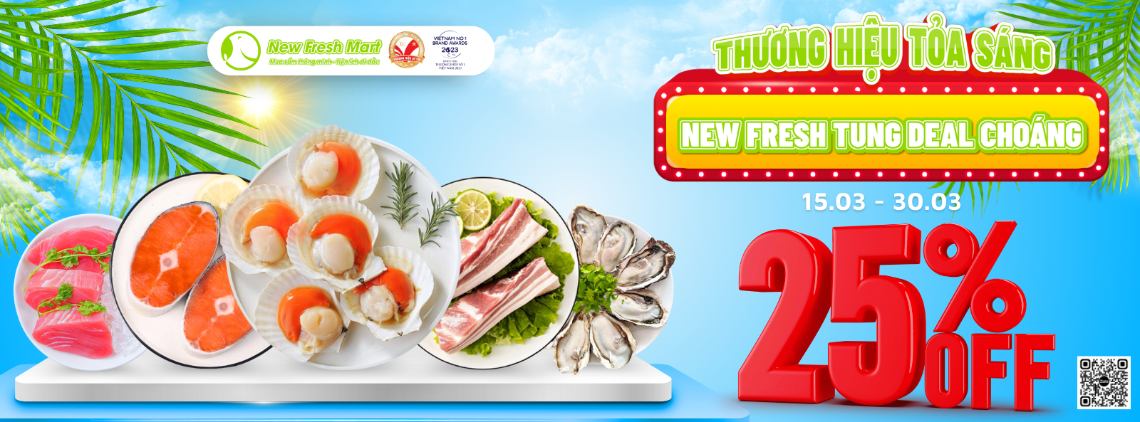 - Siêu khuyến mãi: SALE UP TO 25% loạt sản phẩm thương hiệu New Fresh đa dạng từ thịt, cá, hải sản khắp trong và ngoài nước
