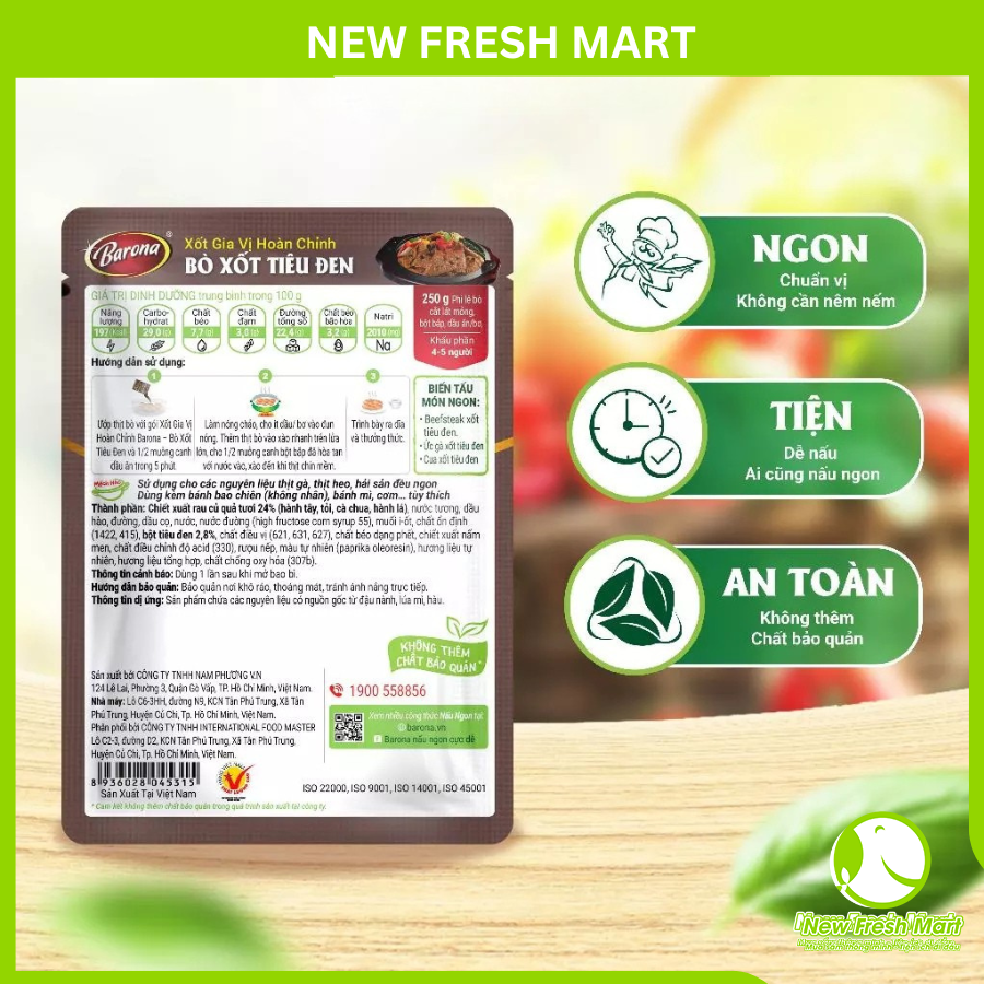 Xốt Bò Xốt Tiêu Đen Barona được pha trộn từ các nguyên liệu chất lượng cao, tập trung vào việc tạo ra hương vị tiêu đen đặc trưng và độ sánh mượt của xốt.