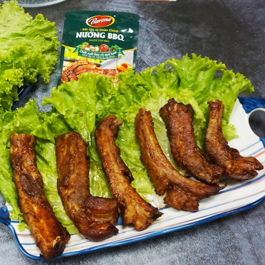 Ướp Xốt: Dùng 1 gói Xốt Nướng BBQ Barona (thông thường là 80g) ướp trực tiếp lên nguyên liệu. Có thể thêm một chút dầu ăn để xốt bám đều và thịt mềm hơn.