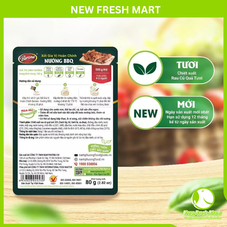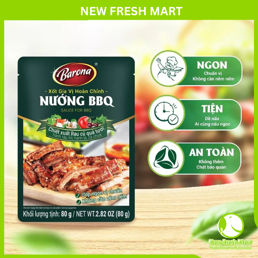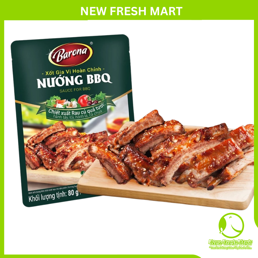 Xốt Nướng BBQ Barona là một hỗn hợp gia vị ướp sẵn, giúp tạo ra hương vị BBQ cân bằng, thường bao gồm các thành phần tạo vị ngọt, chua, mặn và hương khói nhẹ.